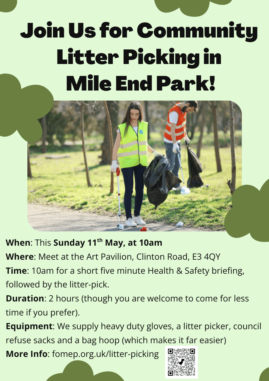 Why not join us this Sunday 9th February to help litter-pick Mile End Park?